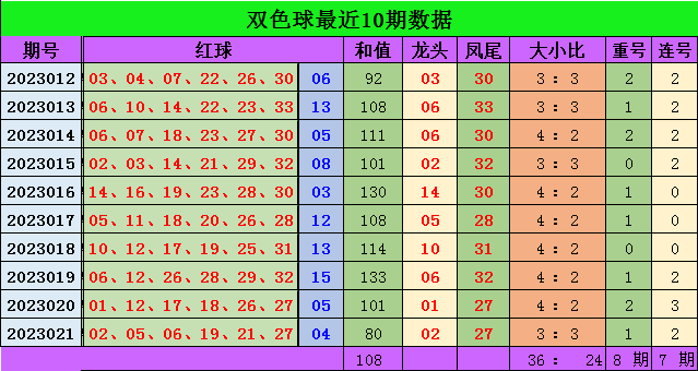 双色球23021期开出奖,本期奖号:红球02 05 06 19 21 27,蓝球04。当期红球号码大小比为3:3,三区比为3:2:1,奇偶比为4:2。样式方面,当期红球开出1组连号05 06,开出1没重号27;蓝球开出遗漏9期的偶数04。
